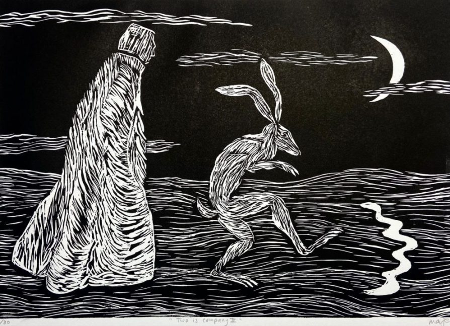 This story made a strong impression on Marjan Wouda, the sculptor of Sir Hare, and she illustrated the story in both drawing and print (image above). It would have been one of the inspirations for the sculpture.